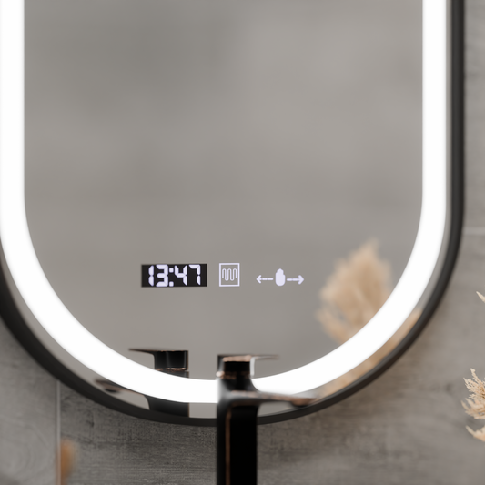 Très bon prix Soldes d'hiverMiroir LED Tactile NOVARA Système Désembuage, Horloge et Température 50 cm Cadre Noir Brossé