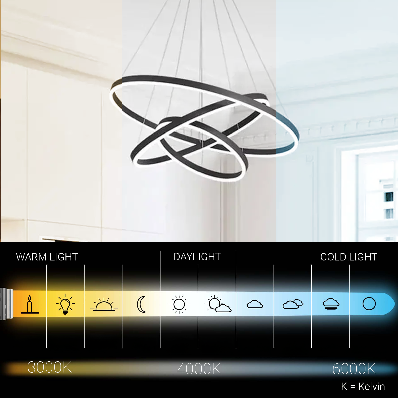 ⚠️ ATTENTION ! : Le réglage d'une certaine température de couleur ne peut être effectué que si les lustres sont éteints et allumés depuis la télécommande. Dans les deux lustres avec et sans télécommande, des pressions successives sur l'interrupteur changent le type de lumière.