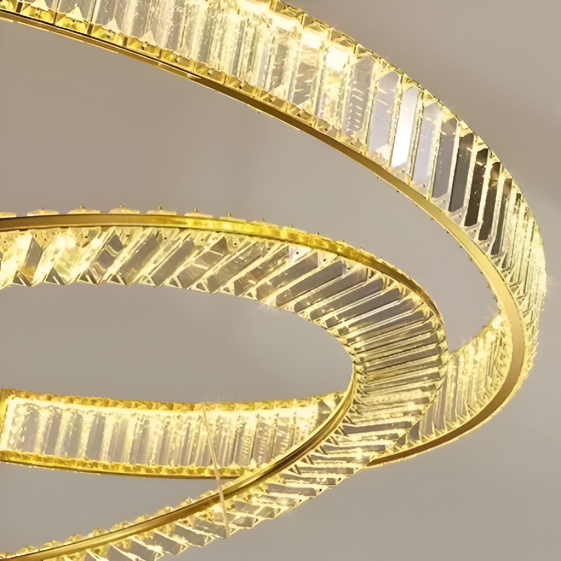 Les deux cercles du lustre sont décorés de cristaux étincelants qui réfractent la lumière LED intégrée, créant ainsi un jeu de lumière captivant et une atmosphère sophistiquée. La finition dorée de la structure ajoute une touche de luxe et de chaleur au design.