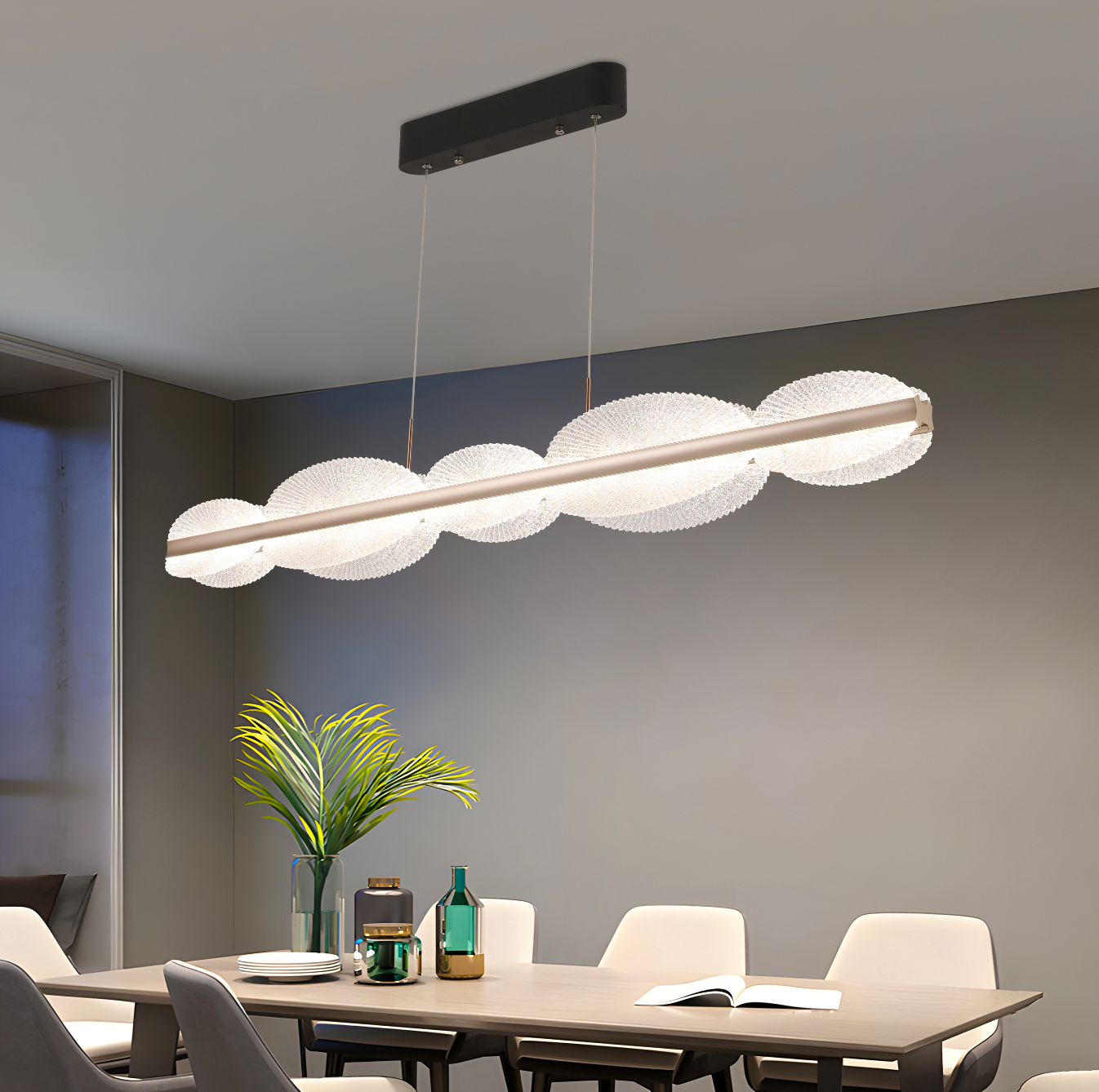 Le système de suspension réglable en hauteur permet d'ajuster le lustre en fonction des proportions du plafond et de la pièce. La lumière est uniformément répartie avec une faible consommation d'énergie, et la structure en métal et en cristal garantit la durabilité et un aspect haut de gamme, adapté aux salons, aux salles à manger ou aux espaces de spectacle.
