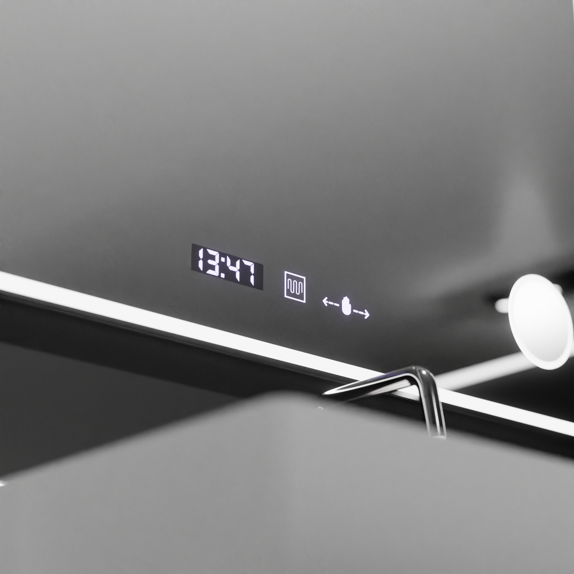 Miroir LED rectangulaire, 80x60 cm, Eclat MotionGlow Marcello, système anti-buée, horloge et thermomètre, loupe cosmétique, intensité variable