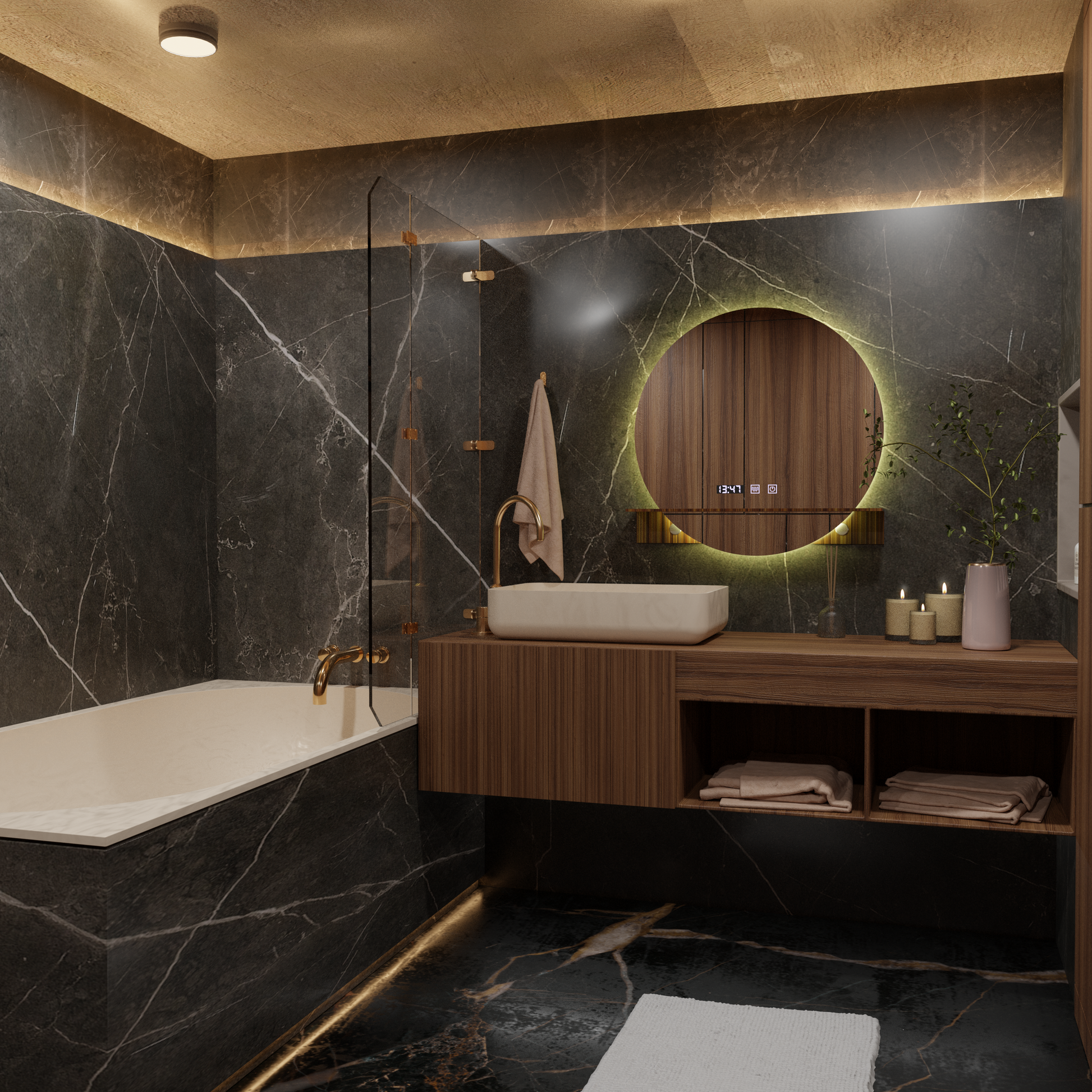 Miroir rond LED, 60 cm, Celeste Majesté Noir MotionGlow Marcello, système anti-buée, horloge et thermomètre, intensité variable